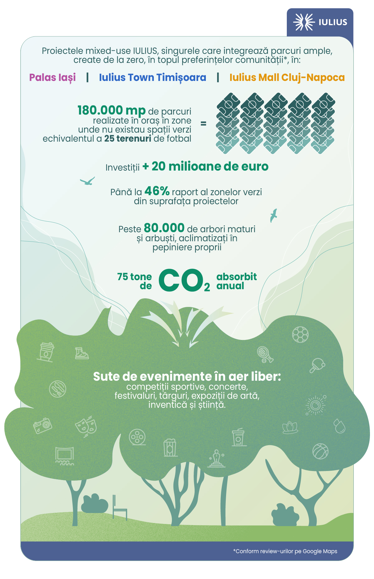IULIUS, 25 de ani de sustenabilitate urbană: Grădini spectaculoase în Iași, Timișoara și Cluj-Napoca – 18 hectare verzi, 80.000 de arbori și o misiune pentru viitor