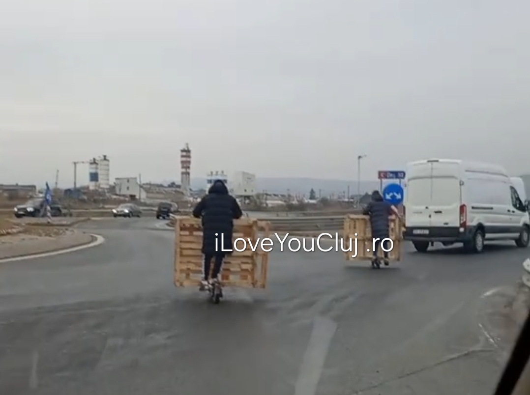 Doi bărbați surprinși transportând paleți pe trotinetă – un gest periculos și ilegal